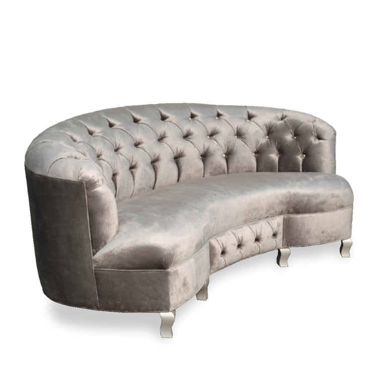 - Upholstered in Imperial "grey" cotton/rayon blend velvet with crystal buttons and silver finished legs.