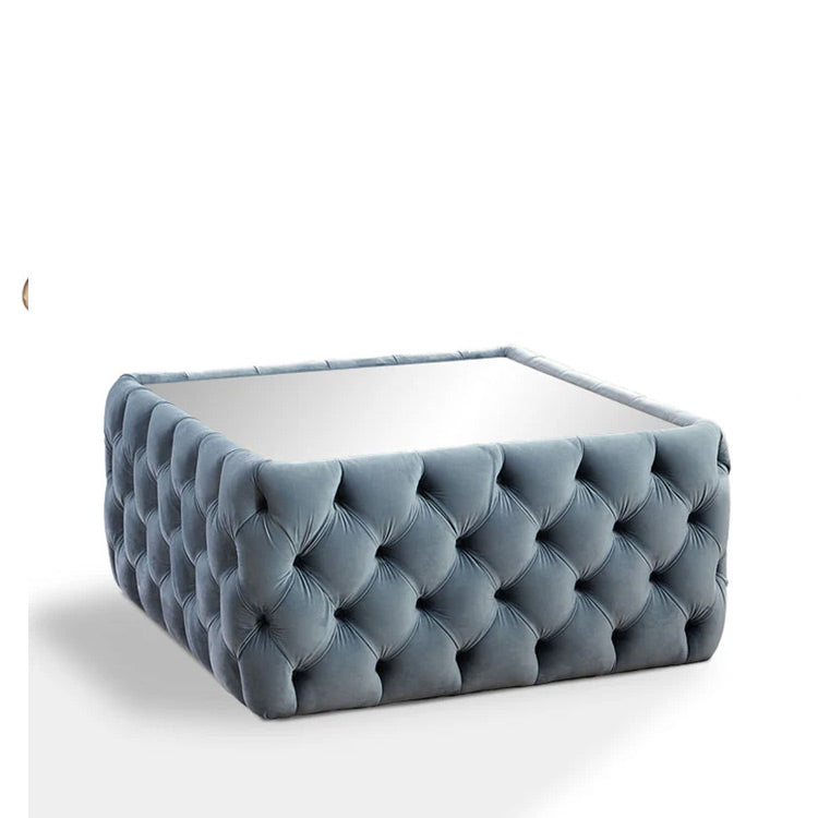 - Upholstered in Duomo "azure" polyester velvet with a mirror top.