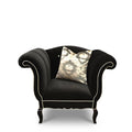 - Benz "Black" polyester velvet with Vegas "charcoal", ivory accents, and black finished legs.