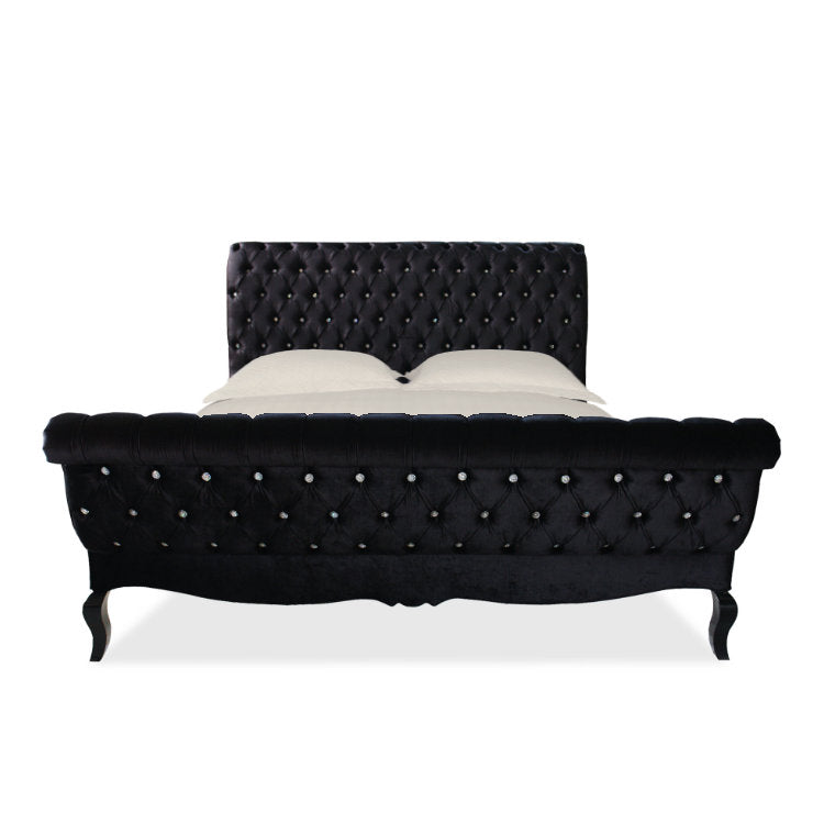 - Upholstered in Imperial "black" rayon/cotton velvet with crystal buttons and black finished legs.