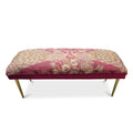 - Upholstered in a Fuchsia polyester velvet with a peacock scarf overlay and brass legs.