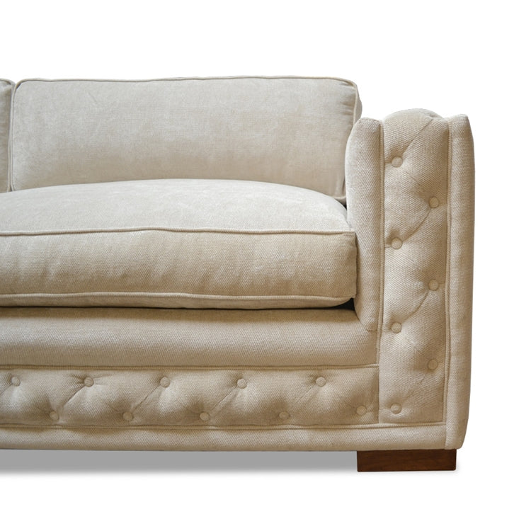 CREAM CHENILLE WITH SELF-WELT, SELF-BUTTONS & DARK WALNUT LEGS.